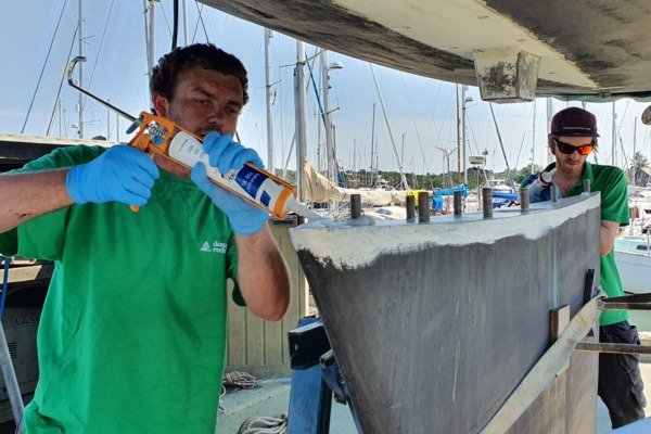 The keel studs are carefully torqued up with a torque converter – simultaneously scraping away the excess ooze of the Sabatack, to leave a tidy join, ready for antifoul or copper coat application and a yacht ready to safely cruise once more.
